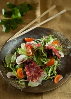 Злегка обсмажена мармурова телятина (50г), подається з сезонним салатом та горіховим соусом.