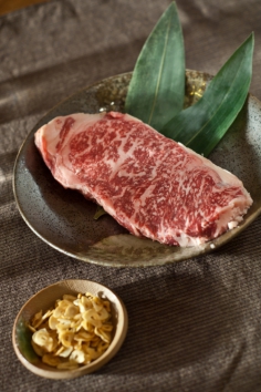 Смажена телятина "Кобе" з часниковими чіпсами, подається з сезонним салатом