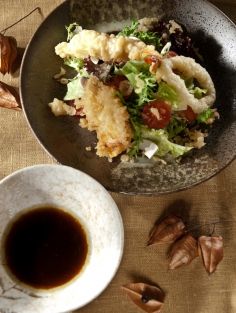 Сезонный салат, креветка, кальмар, восьминіг, соус сомбайдзу.