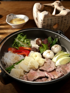Скибочки телятини, обсмажені з овочами. Подаються з яєчним жовтком та соусом скі - які.
