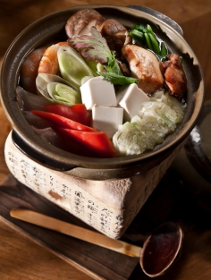 Кревтетки, філе морской риби, куряче філе, гриби, овощі, сир тофу, бульйон з водоростей комбу.