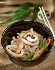 Лапша удон домашнего приготовления, обжаренная с морепродуктами в соевом соусе.