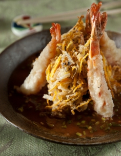 Креветки, обсмажені в тонкому клярі, подаються з овочевими крокетами з грибами, беконом і соусом чірі