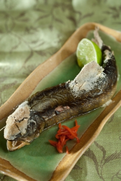 Форель, запечена на грилі, подається с зеленой сілью та гострим імбирем, 1шт.