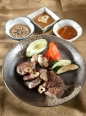 Шматочки вирізки яловичини, обсмажені  з овочами. Соуси: які-ніку, понз та шабу-шабу