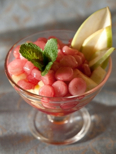 Фруктове асорті, рисові галушки, ягідний сироп.