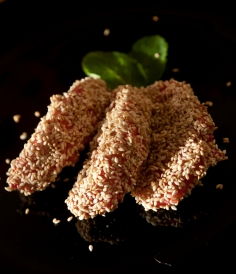 Шматочки стиглого яблука обсмажені с сезамом. Подаються у карамельному соусі.